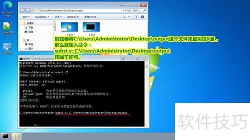 3、 若要将路径C:UsersAdministratorDesktopoutput映射为虚拟X盘,只需打开命令提示符窗口,输入命令subst x: C:UsersAdministratorDesktopoutput,然后按下回车键即可完成设置,此后系统中将出现X盘,指向指定文件夹。