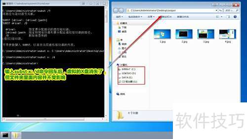 5、 执行subst x: /d命令后,虚拟X盘将被移除,但其中的文件内容不会受到任何影响。