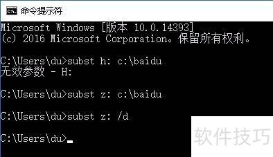 10、 输入subst z: c:aidu并回车,命令执行成功,虚拟磁盘映射完成。