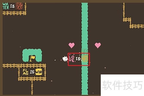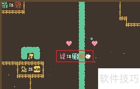 2、 把TELE推入河中,先组成LOVE IS PUSH,推动爱心至旗帜前,再变为LOVE IS TELE传递水流,巴巴兔触碰旗帜即可完成关卡。