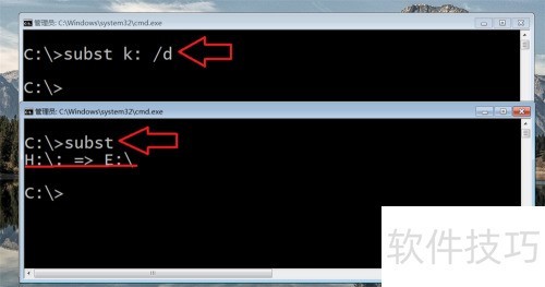 11、 查看已创建的虚拟磁盘:使用subst命令。