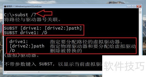 2、 在命令提示符中输入 subst /?,可查看该命令及其参数的详细用法说明。