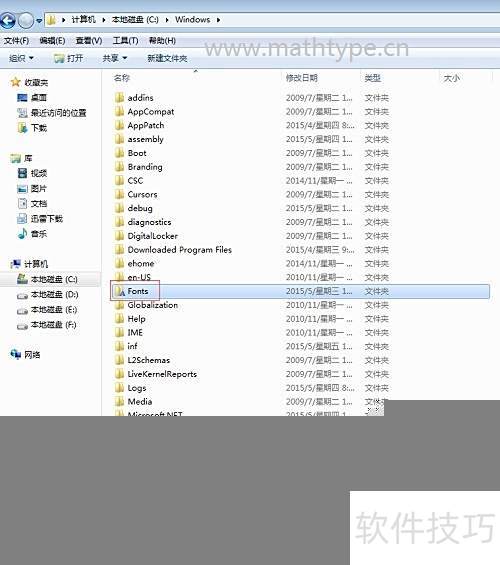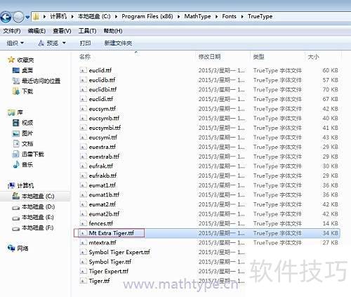 2、 进入MathType安装路径中的C:Program Files (x86)MathTypeFontsTrueType文件夹,查找名为MT Extra.ttf的字体文件。
