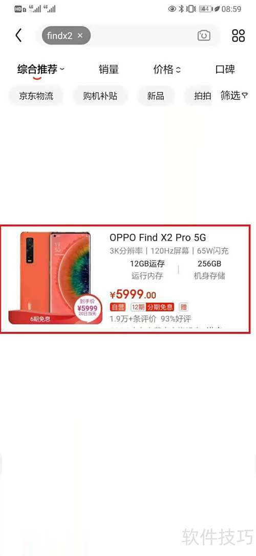 2、 在京东首页搜索栏输入find x2并点击进入相关商品页面。