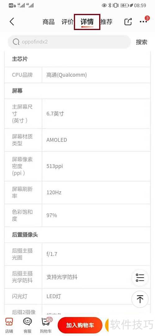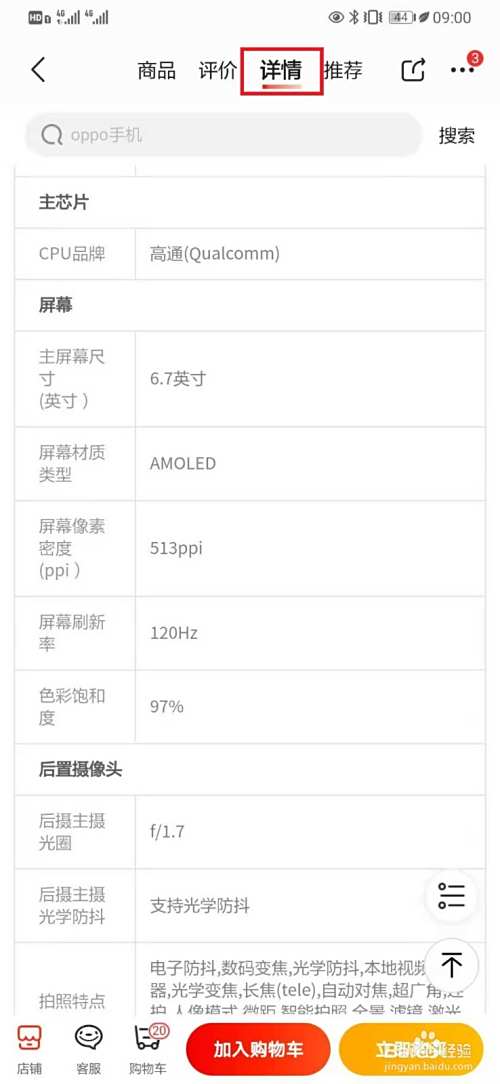 4、 进入OPPO Find X2手机信息界面,点击详情按钮,即可查看该机型的详细参数与配置信息,具体所示。