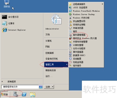 3、 点击开始菜单,进入管理工具中的服务器管理器。