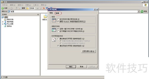 5、 打开文件夹选项对话框,切换至查看选项卡,即可进入文件夹视图与设置界面。