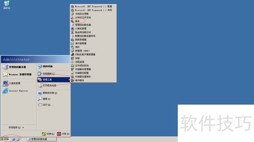 1、 启动Windows Server 2003系统后,依次点击开始菜单和管理工具选项。
