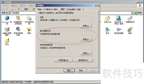 4、 打开系统属性,进入高级选项,选择用户配置文件并点击设置。