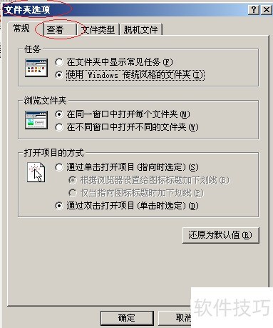 5、 打开文件夹选项,切换到查看标签页进行设置