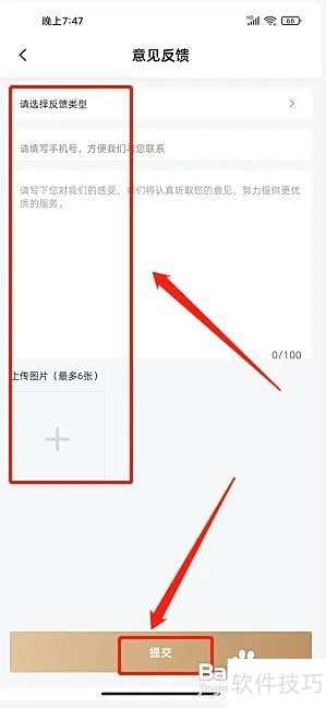 4、 进入意见反馈页面,选择问题类型,填写手机号和反馈信息,上传相关图片后,点击提交即可。