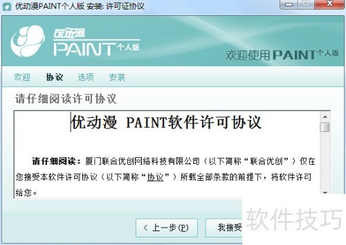 3、 双击下载的优动漫PAINT安装程序运行软件,安装许可协议出现后,勾选我接受继续安装。