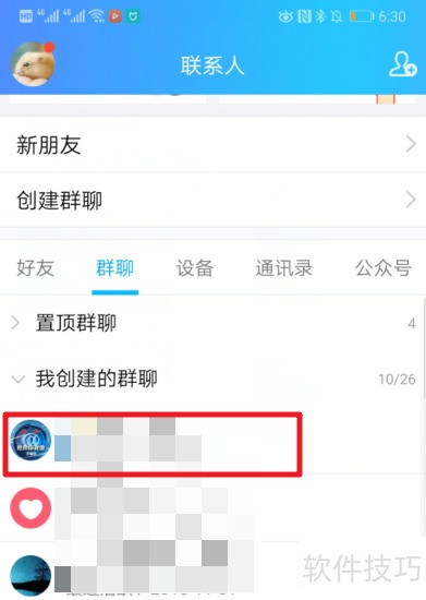 2、 点击后,在顶部选择群聊,进入自己创建或管理的群组即可。