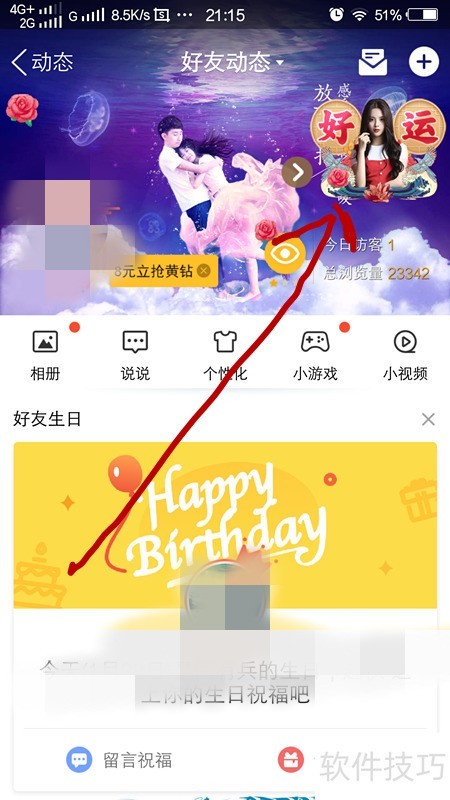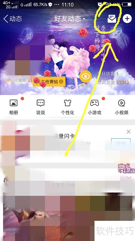 2、 进入动态页面后,点击好友动态进入QQ空间,再点右上角的好运按钮,即可进入QQ新春护身符界面,所示。