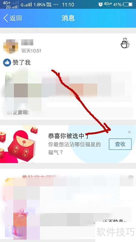 3、 若QQ右上角未显示好运入口,可点击左上角消息界面,进入后即可看到好运提示,所示,点击查收即可。