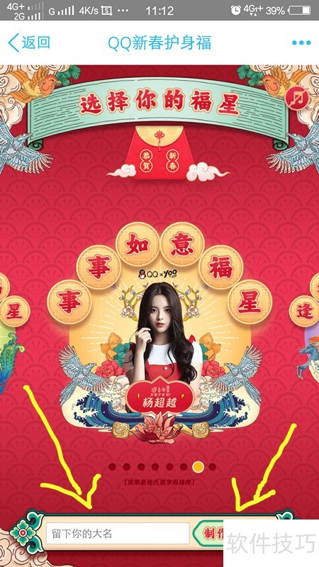 6、 选择八大福星之一,支持左右滑动更换,选定后输入姓名,点击即可生成专属护身符。