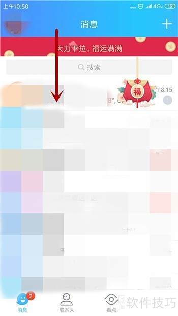 1、 打开手机QQ,从屏幕顶部向下拖动即可操作。