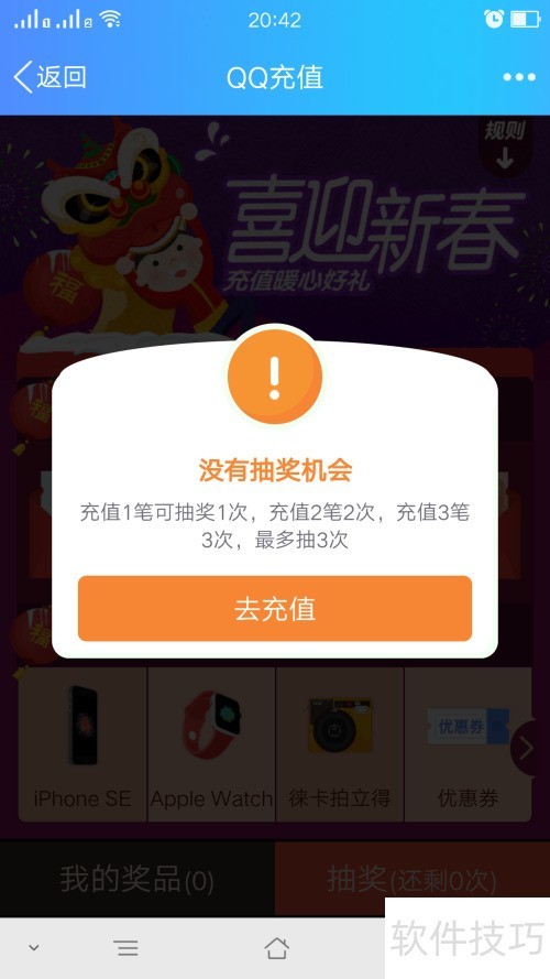 5、 完成充值后,点击领取优惠券或参与抽奖均会弹出提示,按提示操作即可获得相应奖励。