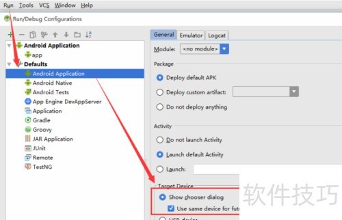 7、 在Android Studio中,依次点击运行菜单中的Edit Configurations,进入默认设置下的Android Application选项,然后选择General标签页。找到Target Device设置项,勾选Show chooser dialog以及Use same device for future launches两个选项。完成配置后,务必点击Apply按钮保存设置,再点击OK关闭窗口。这样即可确保每次运行应用时都能选择目标设备,并在后续启动中沿用相同设备,提升调试效率。具体操作可参考界面提示。
