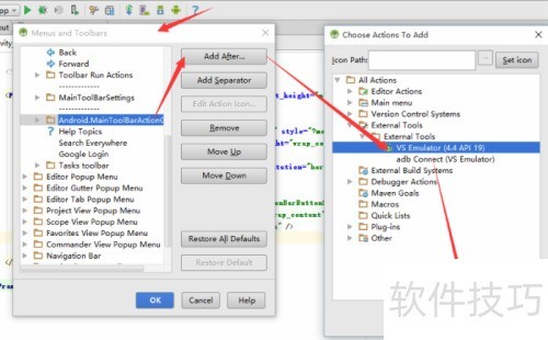 22、 在工具栏空白区域右击,选择自定义菜单和工具栏。进入主工具栏设置后,点击添加后项,在弹出的选项面板中找到外部工具,从中选择VS模拟器(4.4 API 19),确认选择后点击确定完成添加。操作完成后,该模拟器选项将出现在工具栏中,方便快速启动和使用,提升操作效率。