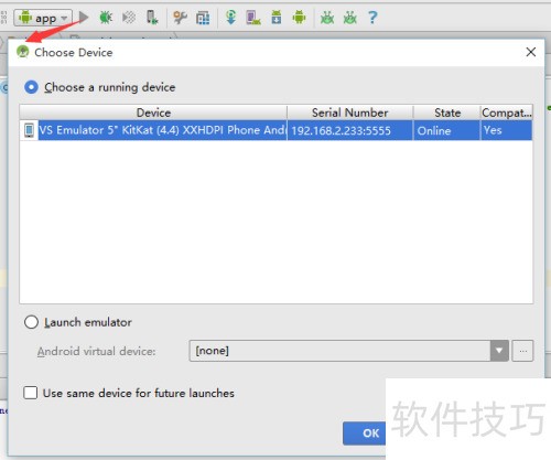 33、 点击运行按钮(绿色箭头),将弹出可供选择的Android设备列表。