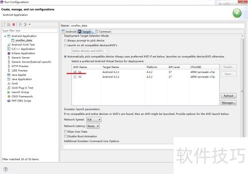 1、 启动Eclipse后,设置好Android模拟器。在项目上右键,选择Run As中的Run Configurations,按照界面提示进行配置,点击Run按钮。随后在弹出的设备选择界面中,选定目标模拟器即可开始运行程序。