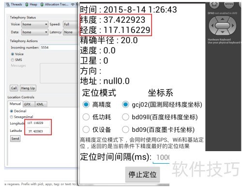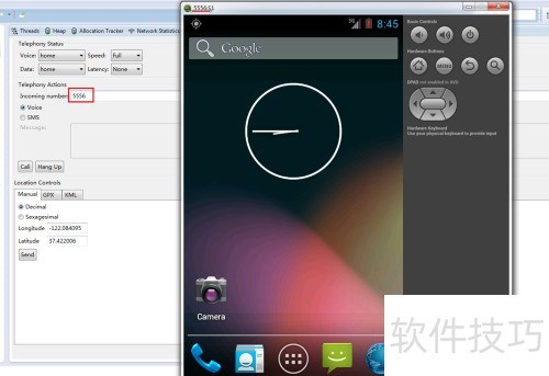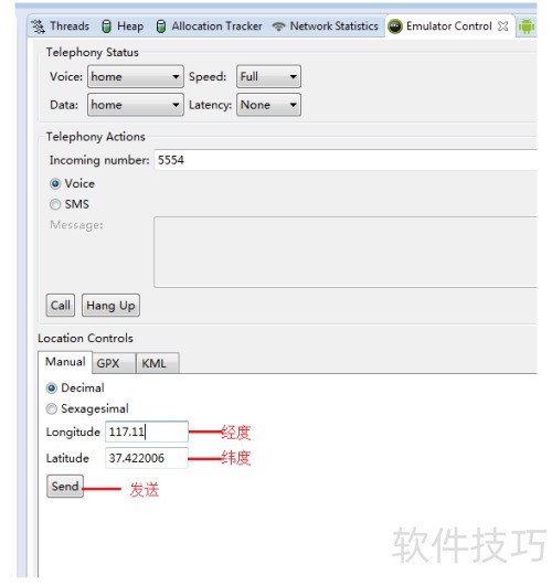通过Eclipse模拟器控制功能,可向安卓模拟器拨打电话、发送短信及传输经纬度信息。