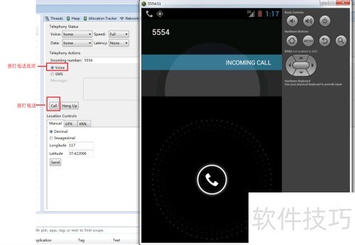 4、 在Emulator Control界面输入目标手机号,此处为模拟器号码,具体号码可参考图示方式查看。