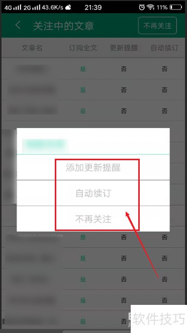 5、 点击文章标题,在弹出的窗口中选择所需选项,即可调整该文章的关注状态。