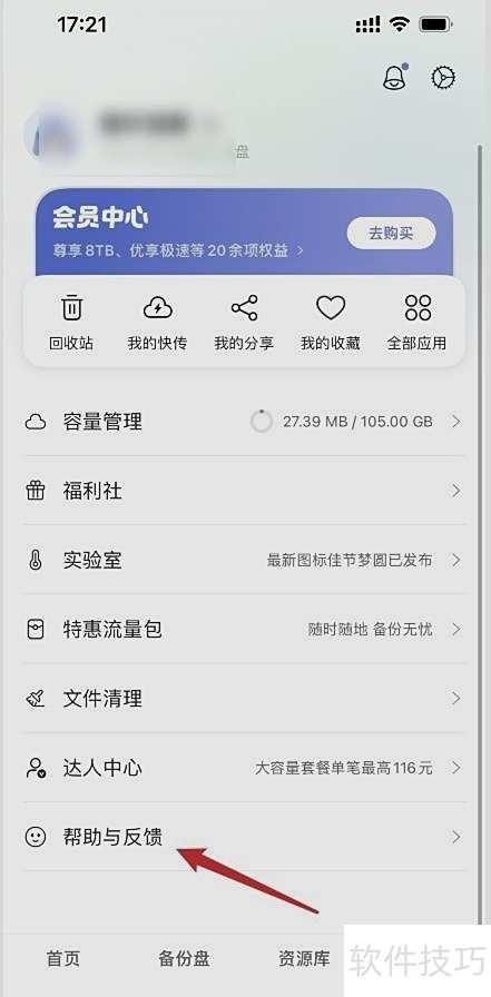 1、 打开阿里云盘APP,进入帮助与反馈页面即可。