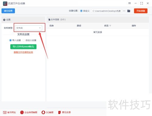 1、 首先启动电脑,运行优速文件生成器2.2.0,进入界面后,在文件类型选项右侧的下拉菜单中选择文件夹,即可完成批量生成文件类型的设置。