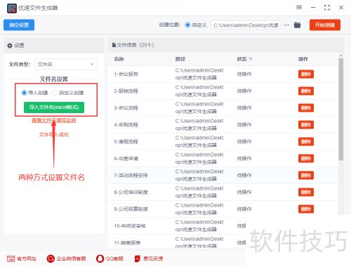 2、 第二步是设置文件名,提供两种方式:一是导入创建,通过点击绿色按钮,将预先准备好的Excel文件导入软件,文件中的名称需按顺序填写在表格第一列;二是自定义创建,将文件夹命名为名称+编号的格式。本次示例采用导入创建方式完成。