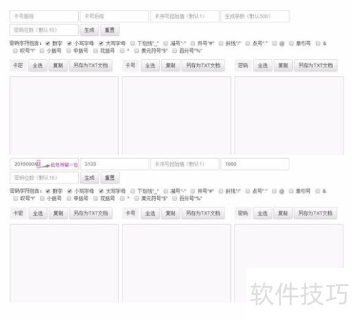 4、 点击生成按钮即可批量创建卡密。完成卡号与密码设置后,系统将自动生成卡密,每组卡密中的卡号和密码可用空格或换行符分隔输出。