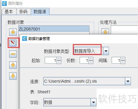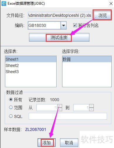 、 添加Excel数据源后,系统将弹出Excel数据源管理窗口,通过浏览选择并导入Excel文件,随后点击测试连接确认无误,再点击添加完成操作,最后关闭数据库设置窗口即可。