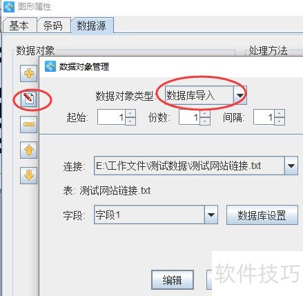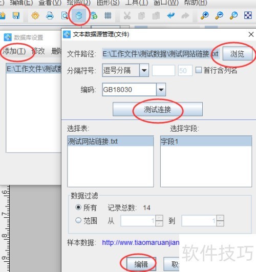 3、 在软件顶部选择数据库设置,添加TXT文本数据源(文件)以导入文本数据。随后在弹出的文本数据源管理(文件)界面中,点击浏览按钮选定所需TXT文件,完成文件选择后,依次点击测试链接确认连接正常,最后点击添加按钮完成数据源配置。