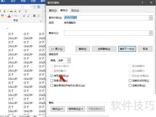 2、 按下Ctrl+H打开查找替换界面,查找内容留空,勾选使用通配符选项,随后点击全部替换,即可快速清除文档中所有汉字字符。此方法高效便捷,适用于批量处理文本内容。