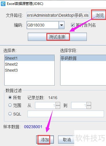 2、 在条码软件中创建空白标签,进入数据库设置,选择添加Excel数据源,按照图示步骤逐一操作,完成Excel表格数据的导入。