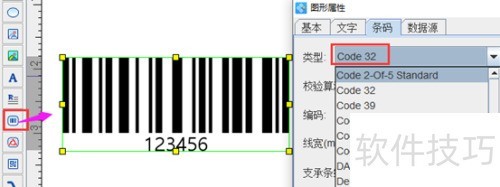 3、 在左侧工具栏选择绘制一维码工具,于白色画布上添加条形码,双击后进入图形属性-条码界面,将条码类型更改为Code32。
