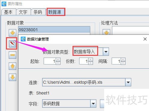 4、 在数据源处,点击数据对象下方的修改按钮,调整条码数据。随后在弹出窗口中将数据对象类型设为数据库导入,并选择之前添加的Excel表连接,最后保存更改即可。