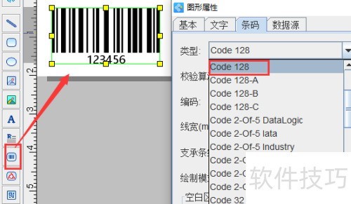 2、 在软件左侧工具栏中选择绘制一维码工具,在画布上添加条形码。系统默认生成的条码类型为Code128,双击条码可进入图形属性-条码设置界面查看或修改类型,用户亦可根据需要自行选择其他类型的条码进行设置与调整。