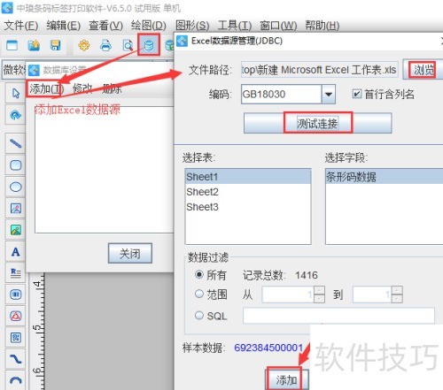 1、 在中琅条码打印软件中创建新标签,进入数据库设置界面,选择添加Excel数据源。在弹出的管理窗口中,点击浏览按钮选中所需Excel文件,随后进行测试连接,确认无误后点击添加完成操作。该步骤可实现将Excel表格中的条码数据导入至标签系统,便于后续批量打印与数据调用,提升工作效率。