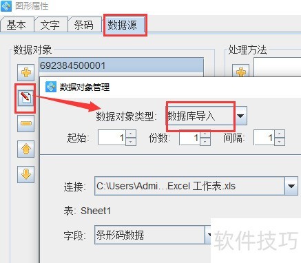 3、 在数据源中点击修改按钮,将数据对象类型更改为数据库导入,选择已导入的Excel表格作为数据库连接,从中提取条形码数据并保存更改。完成设置后,条形码即生成完毕,通过打印预览即可查看批量生成的Code128条形码。