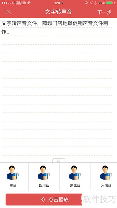 2、 启动应用,输入待转换文字,点击下一步,即可生成对应语音文件。