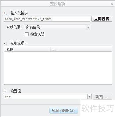 3、 在配置文件选项界面点击查找,于弹出对话框中输入creo_less_restrictive_names后,确认按钮变为灰色,无法直接在此界面完成操作。