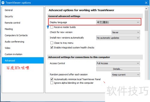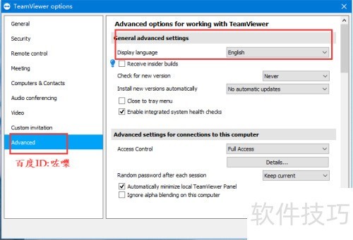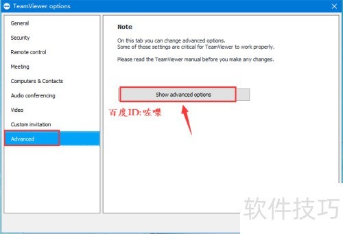 2、 进入TeamViewer高级设置,找到Advanced选项,点击显示高级选项即可开启更多功能设置。
