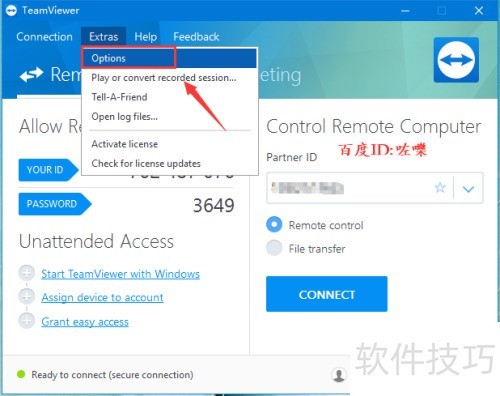1、 打开TeamViewer,进入附加功能中的选项,按图示操作即可将界面语言修改为中文。