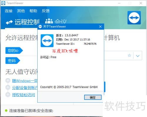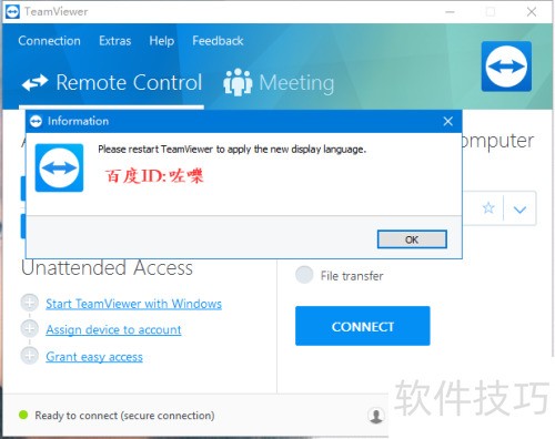5、 设置完成后,界面提示需重启TeamViewer,点击确认即可。