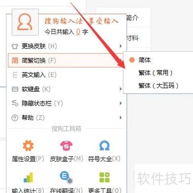 3、 右键点击S图标,打开菜单选择简繁转换功能。