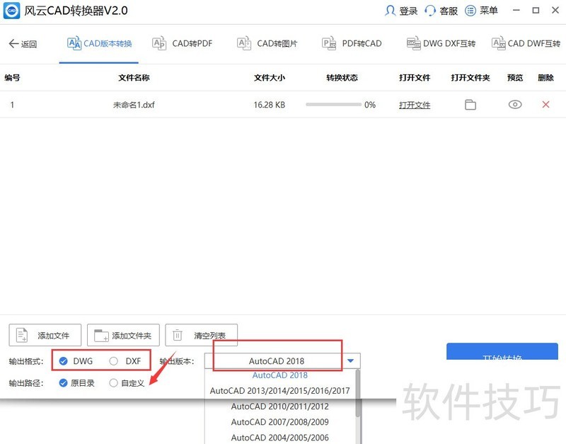 8、 添加需转换的CAD文件后,在下方输出格式中选择目标文件类型,并选定对应的版本,可通过下拉菜单查看更多版本选项。如需更改保存位置,可使用自定义设置调整输出路径,确认无误后点击开始转换即可完成操作。