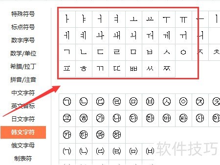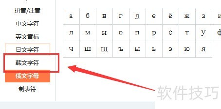 4、 打开符号大全,选择左侧韩文字符菜单项。